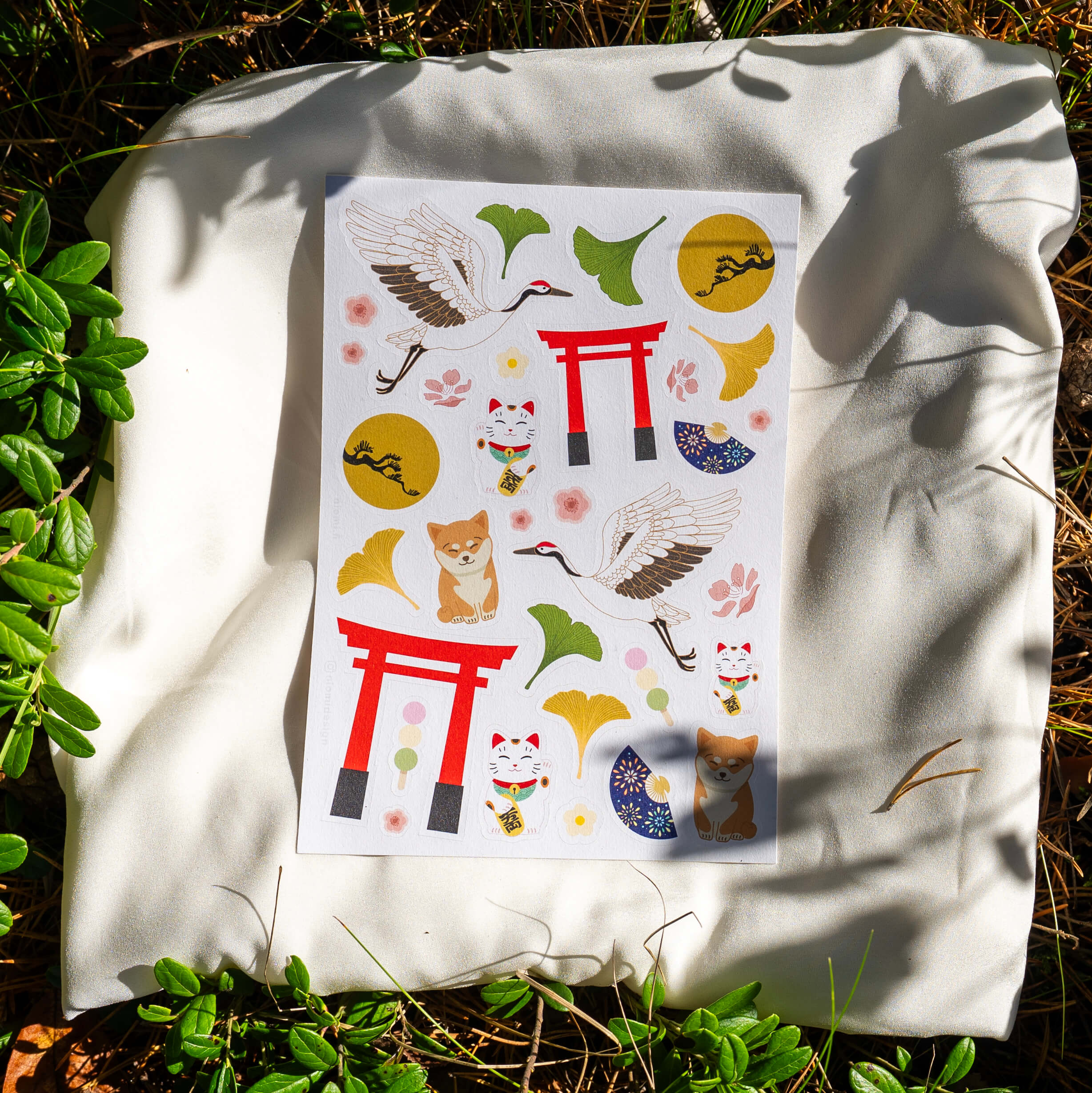 Japanin kauneudesta on poimittu yksityiskohtia tähän ainutlaatuiseen tarra-arkkiin. Näillä tarroilla kohtaat kurjet lentämässä taivaalla, ginkgo-lehtien hienovaraisen kauneuden, torii-portin mysteerin ja paljon muuta.